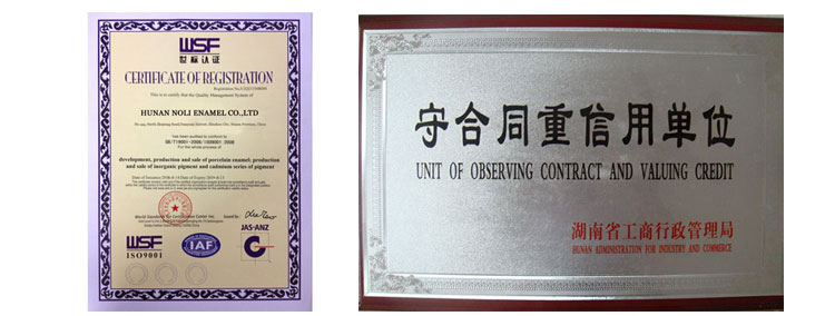 Hunan Noli Enamel Co., Ltd has won many scientific and technological progress awards, and won the “Unit of observing contract and valuing credit” by the Hunan Provincial Administration for Industry and Commerce. Its products are strictly implemented in accordance with ISO9001:2008 international quality management system standards. With the vision of "creating the world's leading enamel frit enterprise", Nolifrit insists on product innovation and differentiation, and is committed to creating the highest quality enamel frit products.